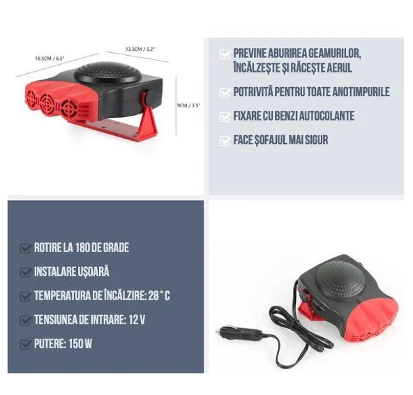 Aeroterma Auto 12V cu Ventilator 2-in-1, Racire sau Incalzire, Putere 150W, Dezaburire si Dezghetare Parbriz sau Geamuri, Reglabila 360 Grade