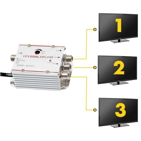 Amplificator de banda larga cu splitter pentru 3 televizoare conectate la acelasi cablu sau antena TV este perfect unei case cu numai 3 televizoare ajutand la reglarea frecventei dandu-i o calitate buna canalelor dumneavoastra scapandu-va de grija pe care o duceati pana acum.