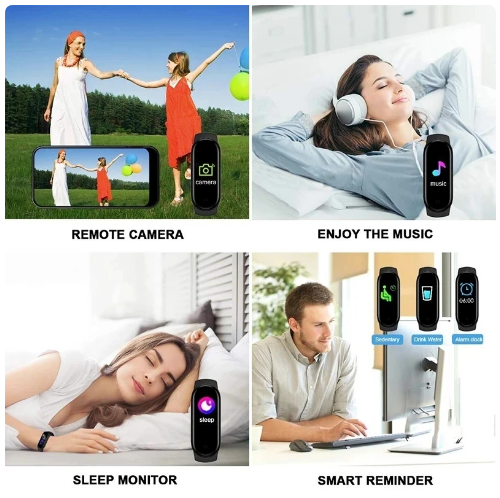 Monitorizeaza, starea de sanatate, presiunea arteriala, bataile inimii, numarul de pasi, caloriile consumate, distanta parcursa, calitatea somnului, perioada de sedentarism, ridici mana si ecranul se aprinde, alarma trezire, alerta prin vibratie la primirea de mesaje de pe SMS, whastsapp, wechat, qq, twitter, facebook.