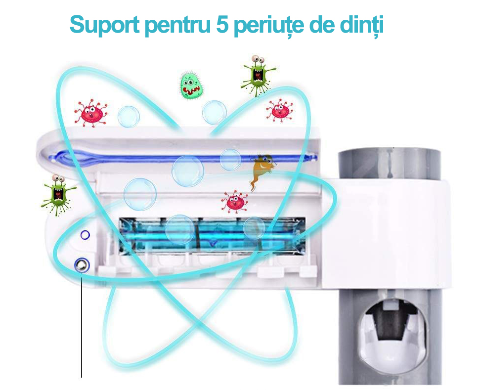 Dozator Pasta De Dinti + Suport Periute Cu Functie de Sterilizare Antibacteriala si Lumina UV ,Model Toby