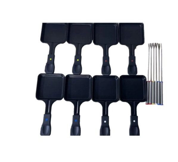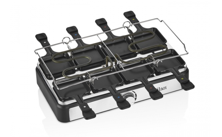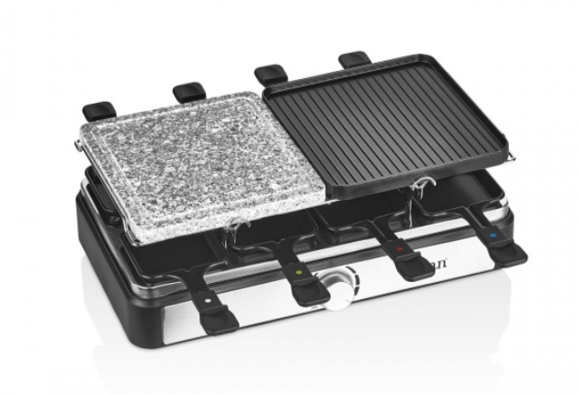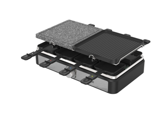 Ce este in cutie: Plita grill/raclette electrica, 8 tigai pentru raclette, 8 spatule, manual de utilizare.