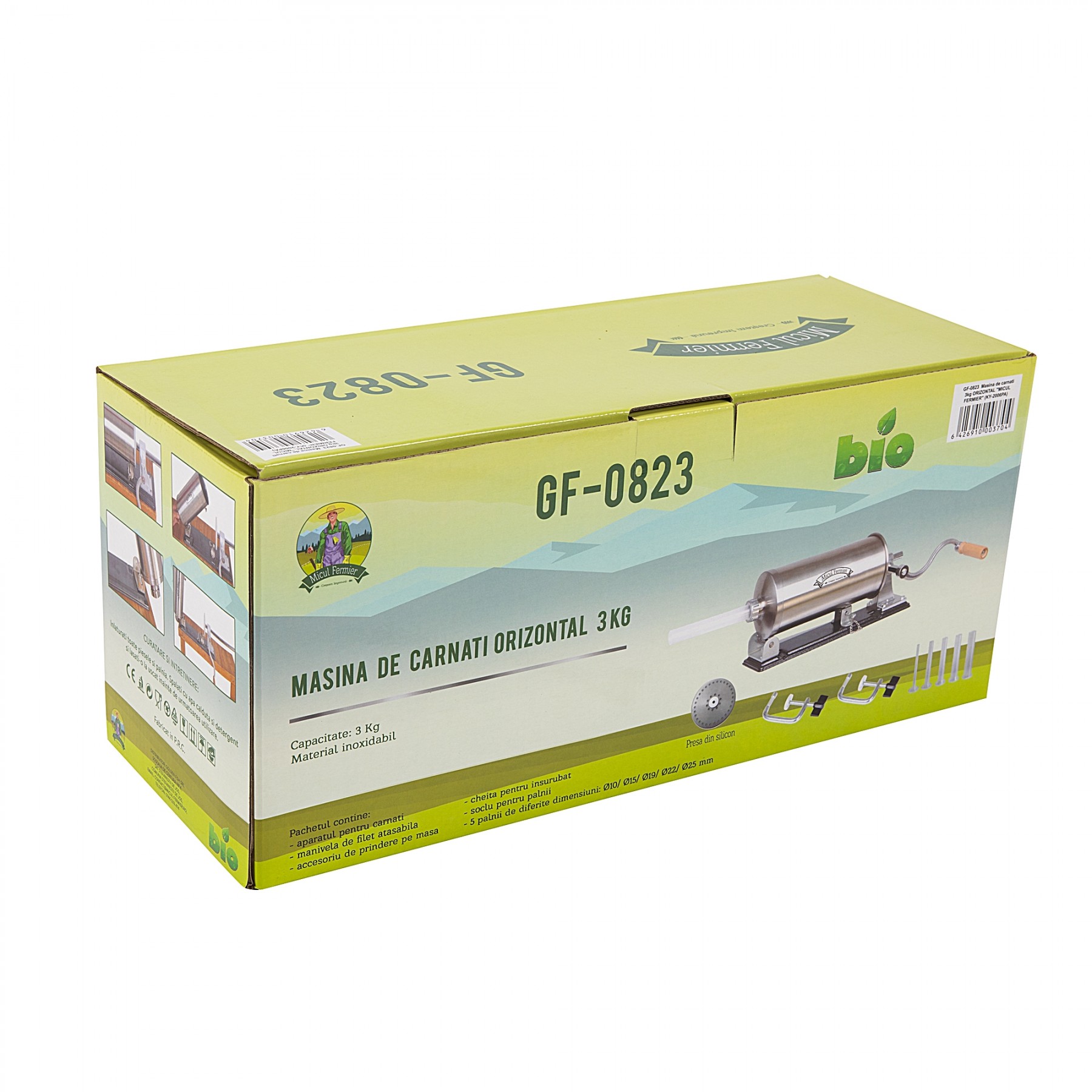 Masina de facut carnati kg (YG-2006PA)orizontala Micul Fermier GF-0823 din aluminiu are un design modern, este confectionata din materiale de calitate care asigura o performanta remarcabila, fiind totodata foarte usor de intretinut. Toate componentele din metal sunt construite special pentru a oferi rezista la presiunea necesara pentru a umple cei mai subtiri carnati. Cilindrul inoxidabil asigura umplerea si curatarea usoara.