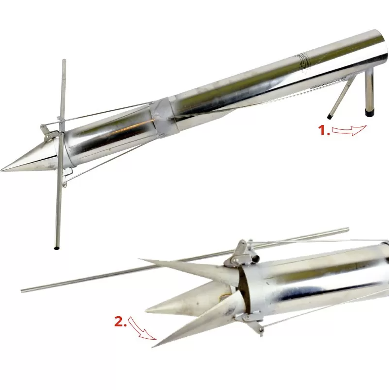 Plantator manual pentru rasaduri din material inoxidabil cu tub de directionare si o supapa care automatizeaza procesul de plantat rasaduri.