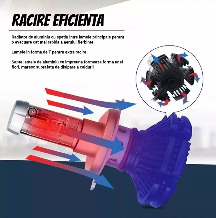 Ventilatorul puternic TurboCool de 10.000 RPM asigura racirea becurilor LED pentru peste 50.000 de ore de functionare.