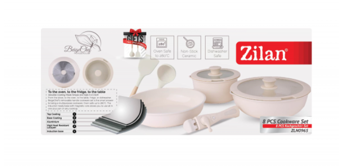Setul de vase de gatit Zilan ZLN0965 este alcatuit din 8 piese ( 2 oale, 1 tigaie , 2 capace din sticla, 1 maner, 1 paleta si 1 polonic)
