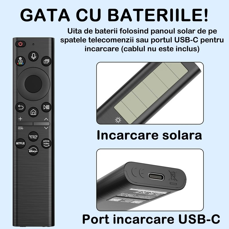 Telecomanda compatibila Samsung BN59-01385A, comanda vocala, incarcare panou solar si USB-C, Negru