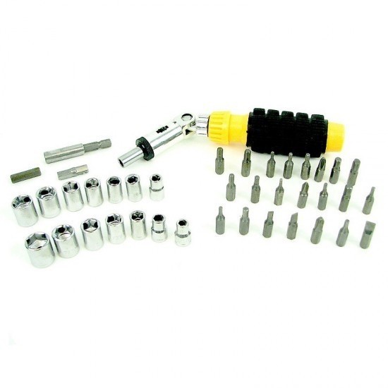 Trusa Hobby 41 piese include o surubelnita cu cap mobil si clicket, un prelungitor si o multitudine de capete tip surubelnita si tip tubulara.